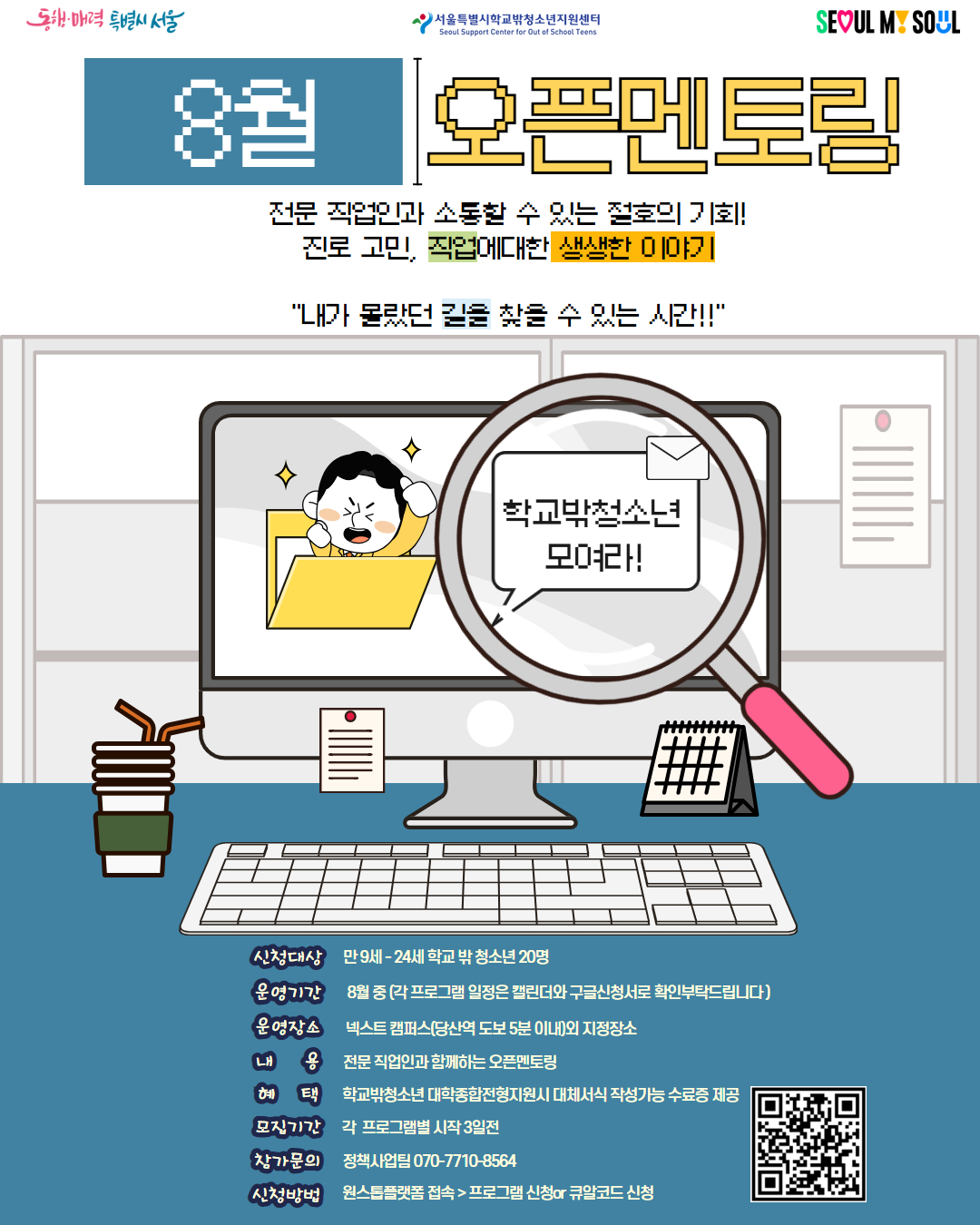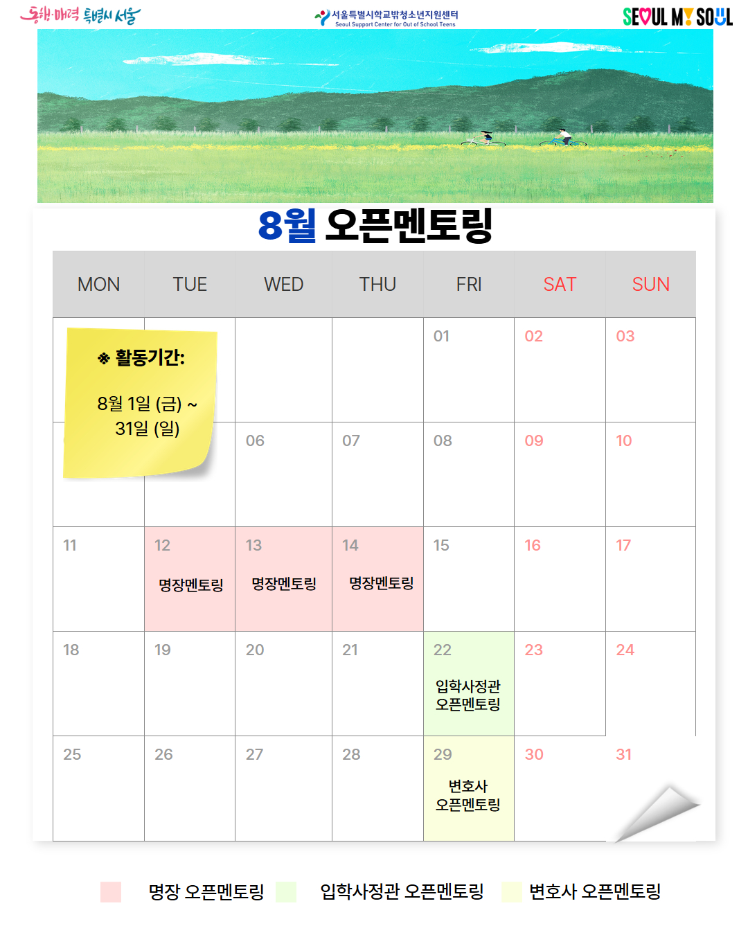 원스톱 서비스 신청 HOME > 원스톱프로그램 > 원스톱 서비스 신청 링크공유 프린트 8월 오픈멘토링 원스톱 장소 넥스트캠퍼스 원스톱 방식 온라인 프로그램 기간 2025-08-02 ~ 2025-08-31 [화]14:00~ 18:00 [수]14:00~ 18:00 [목]14:00~ 18:00 [금]15:00~ 17:00 신청 기간 2025-07-31 ~ 2025-08-31 원스톱 프로그램 내용 신청완료 설문지 "제출" 완료 후에 "신청완료" 버튼을 눌러 신청 해주세요. 프로그램 신청 목록