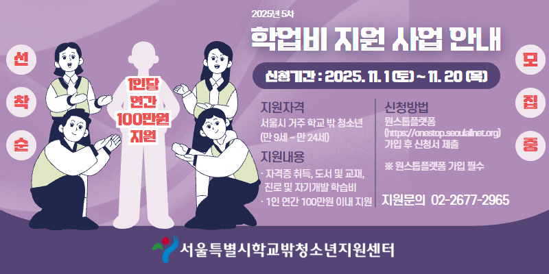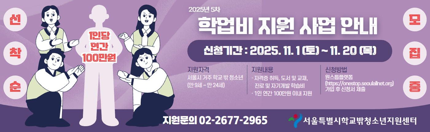 2025년 학교 밖 청소년 수업료 지원(4차) 모집