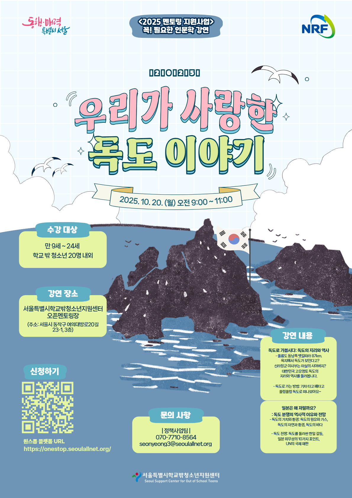 프로그램 신청 HOME > 프로그램 > 프로그램 신청 링크공유 프린트 서울특별시 학교밖청소년 지원센터의 인문학 강연 -독도- 대상 모집 인원 프로그램 기간 2025-10-20 ~ 2025-10-20 [월]09:00~ 11:00 신청 기간 2025-09-24 ~ 2025-10-16 장소 서울특별시학교밖청소년지원센터 방식 오프라인 원스톱 프로그램 내용 신청완료 설문지 "제출" 완료 후에 "신청완료" 버튼을 눌러 신청 해주세요. 프로그램 신청 목록