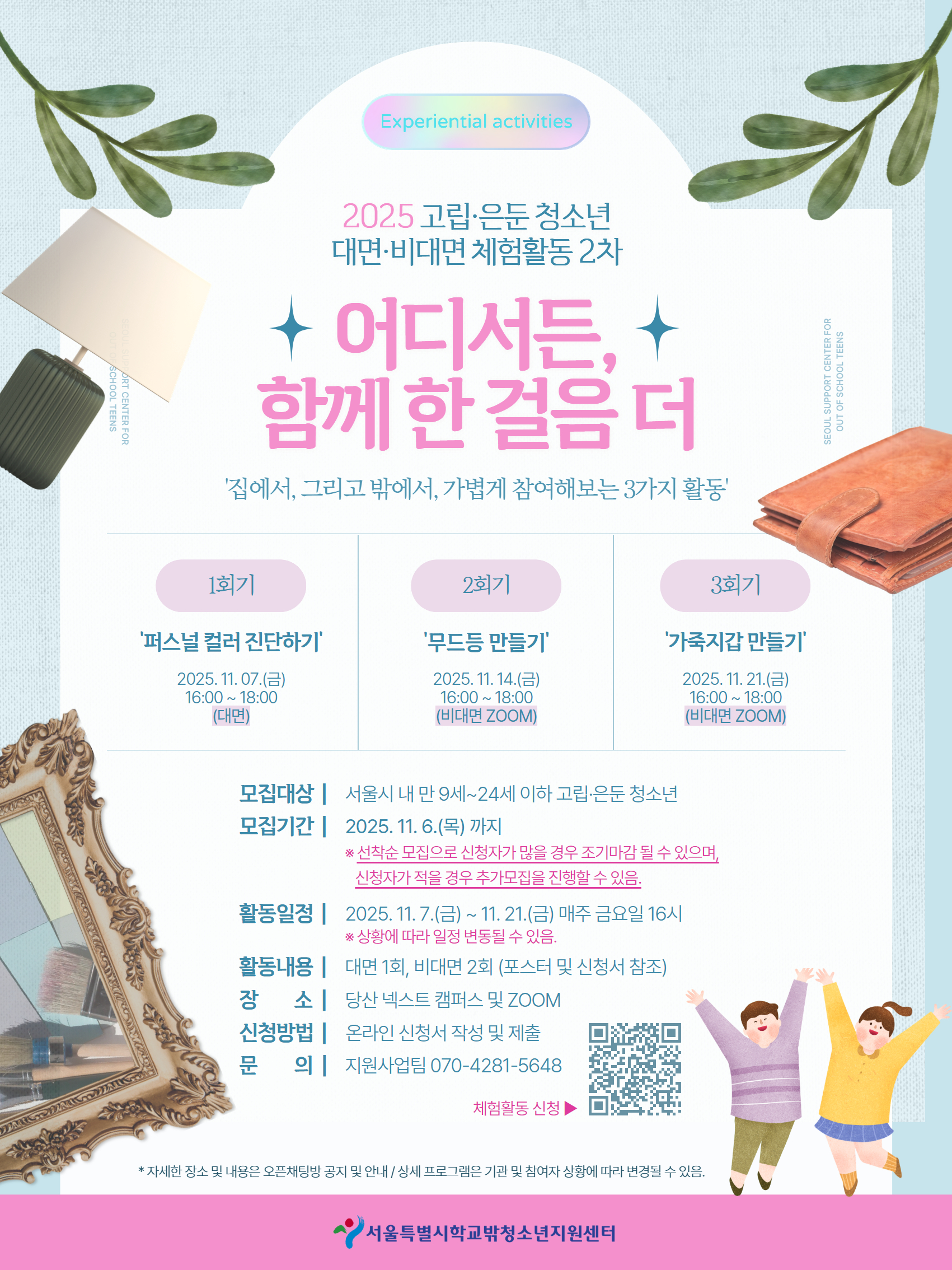 원스톱 서비스 신청 HOME > 원스톱프로그램 > 원스톱 서비스 신청 링크공유 프린트 2025년 고립은둔 청소년 체험활동 2차 안내 원스톱 장소 온라인 ZOOM 원스톱 방식 온라인 프로그램 기간 2025-11-07 ~ 2025-11-21 [금]16:00~ 18:00 신청 기간 2025-10-27 ~ 2025-11-06 원스톱 프로그램 내용 신청완료 설문지 "제출" 완료 후에 "신청완료" 버튼을 눌러 신청 해주세요. 프로그램 신청 목록