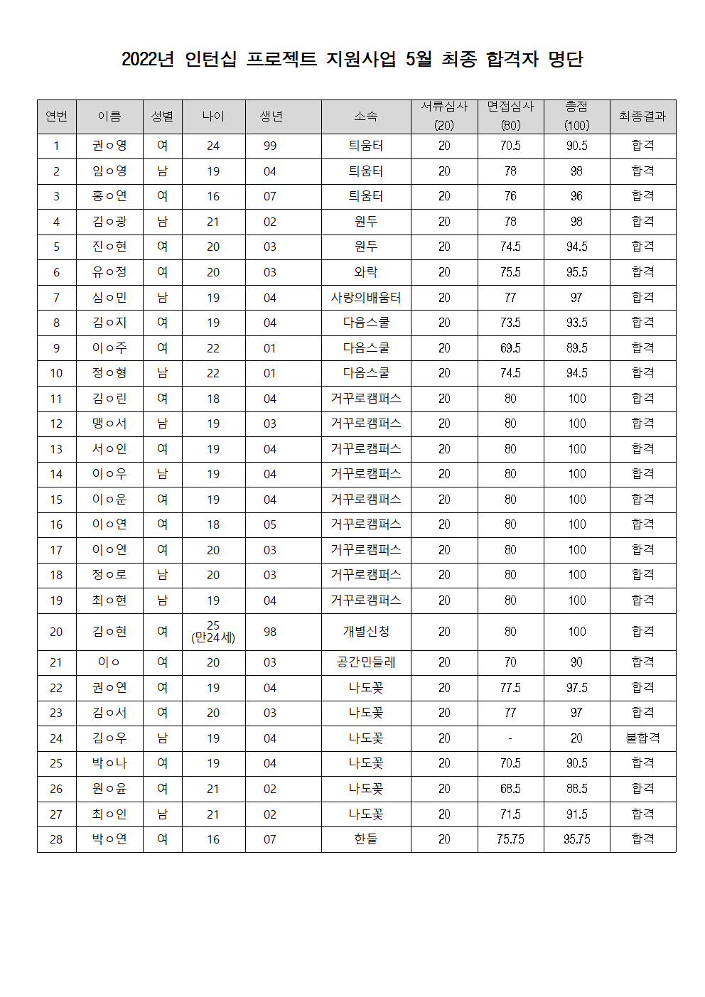 [공지]2022년 인턴십 프로젝트 지원사업 6월 최종 합격자 명단