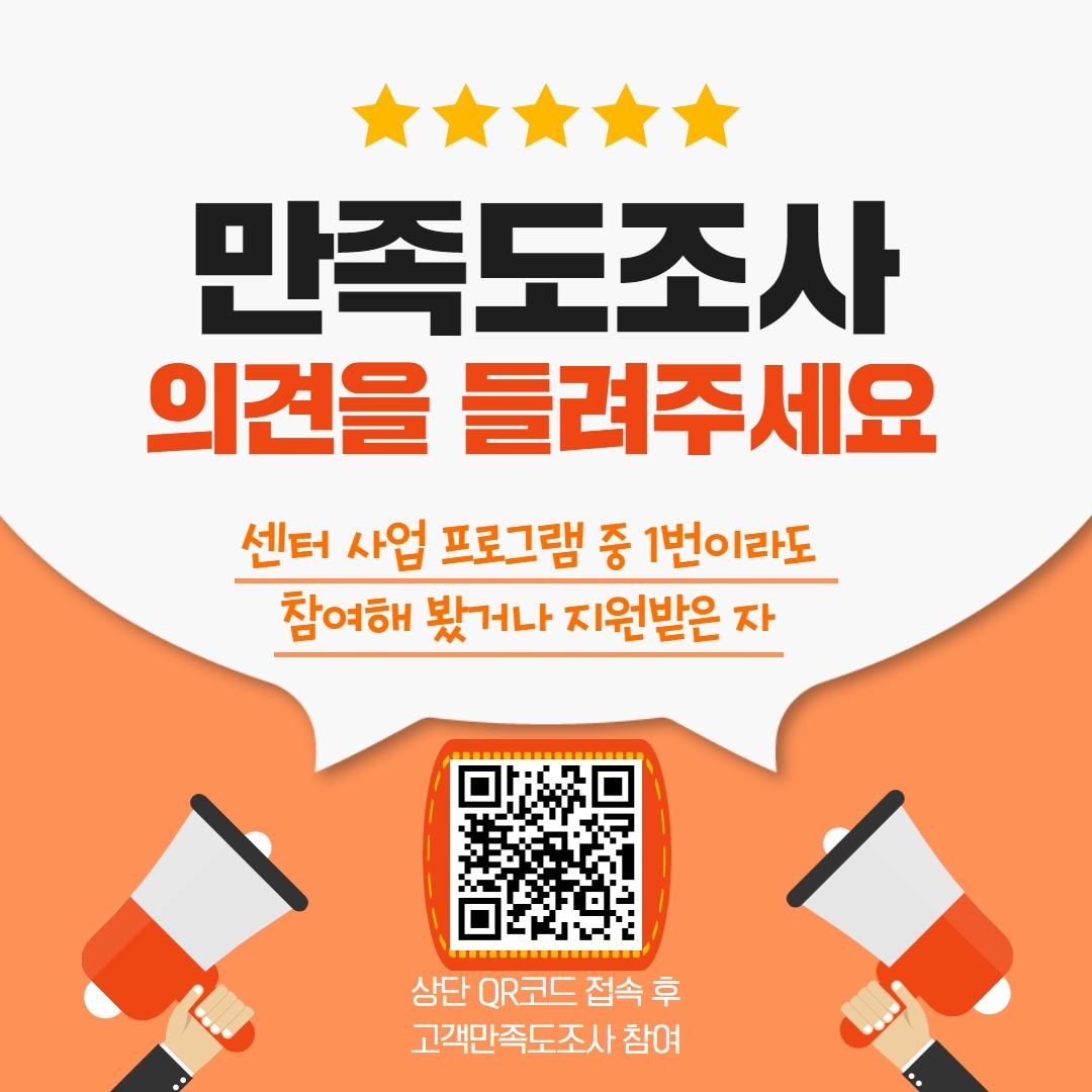 공지사항 HOME > 커뮤니티 > 공지사항 링크공유 프린트 2023년 서울특별시학교밖청소년지원센터 만족도 조사 실시 관리자 0 486 0 0 Print 글주소 07-13 서울특별시학교밖청소년지원센터의 이용자 만족도 조사를 실시하오니 많은 참여와 관심 부탁드립니다.1. 조사기간: 2023년 7월 13일(목) ~ 8월 12일(토) 2. 설문방법: 아래 이미지 QR코드 또는 링크로 접속3. 링 크: http://youthsurvey.kr/sub/survey.php?ix=MXx8MzA=4. 문 의: 기획행정팀 02-2675-1319 0 0 스크랩 목록 이전글 다음글 제목+내용 제목 내용 회원명 회원아이디 번호 제목 글쓴이 날짜 조회수 공지 [서울특별시학교밖청소년지원센터] 찾아오는 길 안내_보라매공원역편 관리자 08-25 981 공지 서울특별시학교밖청소년지원센터 지원 연령 및 대상 안내 관리자 03-16 10,529 공지 [인턴십] 2025년 인턴십 활동비지원 종료안내 관리자 12-15 50 공지 [2025년] 학교 밖 청소년 증빙서류 발급 안내 관리자 04-08 4,545 공지 (※2025년 지원 마감) 2025년 학업지원 사업 [안내문 및 신청서식] 관리자 04-01 10,874 공지 (수정)2025년 성범죄 경력조회 회신서 발급 절차 안내문 관리자 03-20 3,617 507 제21대 대통령선거 휴무 안내(20250603) 관리자 06-02 118 506 근로자의 날 휴무 안내(20250501) 관리자 04-29 128 505 2024년 서울특별시학교밖청소년지원센터 시보조금 결산내역서 관리자 04-22 212 504 센터 사무실 공사로 인한 업무 제한 안내(20250410) 관리자 04-09 194 503 서울특별시학교밖청소년지원센터 2025년 예산내역 공고 관리자 01-15 626 502 서울특별시학교밖청소년지원센터 2024년 3차 전용 예산내역 공고 관리자 12-26 226 501 2023년 서울특별시학교밖청소년지원센터 시보조금 결산내역서 관리자 03-29 214 500 서울특별시학교밖청소년지원센터 2024년 전용 예산내역 공고 관리자 05-16 357 499 2024년 서울특별시학교밖청소년지원센터 상반기(1~6월) 수의계약 내역 관리자 06-28 562 498 2024년 학교 밖 청소년 증빙서류 발급 안내 관리자 06-05 1,171 497 홈페이지 서버 변경 안내 관리자 05-31 239 496 2024년 5월 센터 휴무일 안내 관리자 04-30 317 495 2024년 학교 밖 청소년 및 위기청소년 체험활동 모집완료(선정자 안내) 관리자 04-19 424 494 2024년 학교 밖 청소년 동아리지원사업 선정결과 안내 관리자 04-12 438 493 2024년 학교 밖 청소년 인식개선 온라인 이벤트 당첨자 안내 관리자 04-11 246 492 2024년 학교 밖 청소년 문신제거 지원 선정자 알림 관리자 04-11 227 491 서울특별시학교밖청소년지원센터 기자재 대여 지침 관리자 04-15 279 490 2022년 인턴십 프로젝트 지원사업 3월 최종합격자 발표 관리자 03-29 172 489 2024년 성범죄 경력 조회 절차안내 관리자 03-22 83 488 2023년 서울특별시학교밖청소년지원센터 하반기(7~12월) 수의계약 내역 관리자 01-02 248 목록 <1234567>맨끝 ›