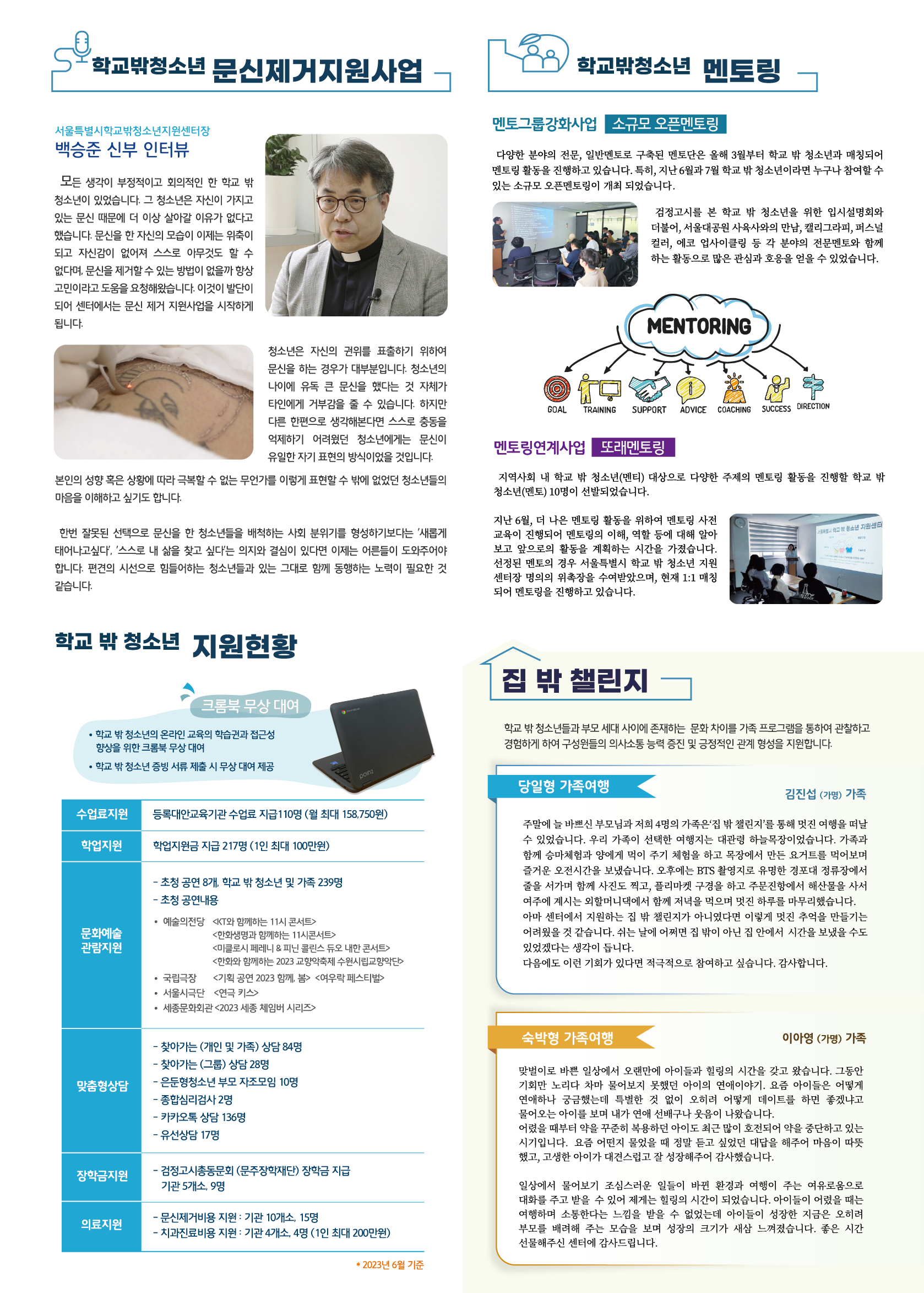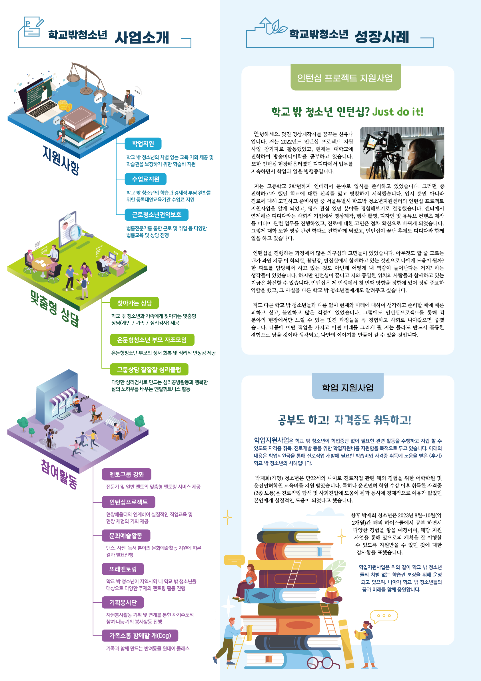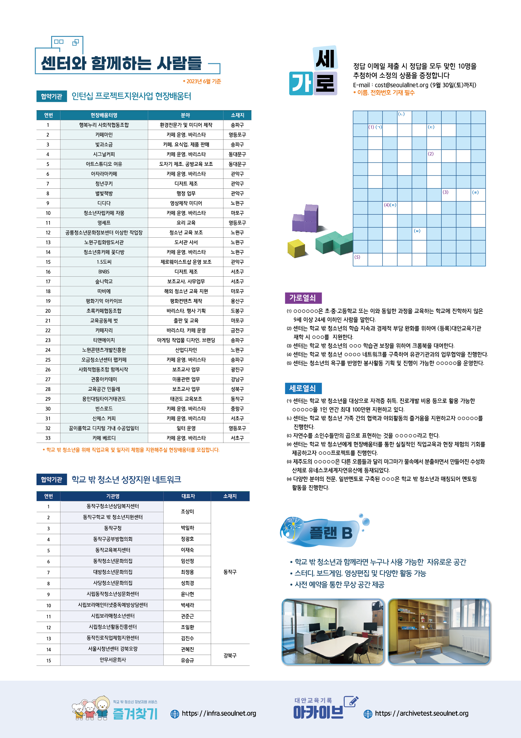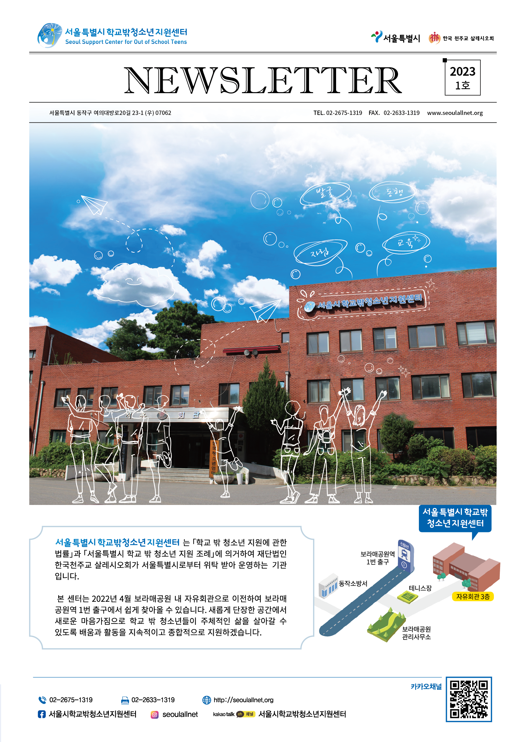 공지사항 HOME > 커뮤니티 > 공지사항 링크공유 프린트 2023년 1호 서울특별시학교밖청소년지원센터 뉴스레터 관리자 0 534 0 0 Print 글주소 09-01 ※ 가로세로 십자말풀이 정답을 이메일로 보내주세요!모두 맞힌 10명을 추첨하여 소정의 상품을 증정합니다. (9월 30일(토)까지)E-mail: cost@seoulallnet.org *이름 전화번호 기재 필수 0 0 스크랩 목록 이전글 다음글 제목+내용 제목 내용 회원명 회원아이디 번호 제목 글쓴이 날짜 조회수 공지 [서울특별시학교밖청소년지원센터] 찾아오는 길 안내_보라매공원역편 관리자 08-25 980 공지 서울특별시학교밖청소년지원센터 지원 연령 및 대상 안내 관리자 03-16 10,528 공지 [인턴십] 2025년 인턴십 활동비지원 종료안내 관리자 12-15 49 공지 [2025년] 학교 밖 청소년 증빙서류 발급 안내 관리자 04-08 4,544 공지 (※2025년 지원 마감) 2025년 학업지원 사업 [안내문 및 신청서식] 관리자 04-01 10,874 공지 (수정)2025년 성범죄 경력조회 회신서 발급 절차 안내문 관리자 03-20 3,617 507 제21대 대통령선거 휴무 안내(20250603) 관리자 06-02 118 506 근로자의 날 휴무 안내(20250501) 관리자 04-29 128 505 2024년 서울특별시학교밖청소년지원센터 시보조금 결산내역서 관리자 04-22 212 504 센터 사무실 공사로 인한 업무 제한 안내(20250410) 관리자 04-09 194 503 서울특별시학교밖청소년지원센터 2025년 예산내역 공고 관리자 01-15 626 502 서울특별시학교밖청소년지원센터 2024년 3차 전용 예산내역 공고 관리자 12-26 226 501 2023년 서울특별시학교밖청소년지원센터 시보조금 결산내역서 관리자 03-29 214 500 서울특별시학교밖청소년지원센터 2024년 전용 예산내역 공고 관리자 05-16 357 499 2024년 서울특별시학교밖청소년지원센터 상반기(1~6월) 수의계약 내역 관리자 06-28 562 498 2024년 학교 밖 청소년 증빙서류 발급 안내 관리자 06-05 1,171 497 홈페이지 서버 변경 안내 관리자 05-31 239 496 2024년 5월 센터 휴무일 안내 관리자 04-30 317 495 2024년 학교 밖 청소년 및 위기청소년 체험활동 모집완료(선정자 안내) 관리자 04-19 424 494 2024년 학교 밖 청소년 동아리지원사업 선정결과 안내 관리자 04-12 438 493 2024년 학교 밖 청소년 인식개선 온라인 이벤트 당첨자 안내 관리자 04-11 246 492 2024년 학교 밖 청소년 문신제거 지원 선정자 알림 관리자 04-11 227 491 서울특별시학교밖청소년지원센터 기자재 대여 지침 관리자 04-15 279 490 2022년 인턴십 프로젝트 지원사업 3월 최종합격자 발표 관리자 03-29 172 489 2024년 성범죄 경력 조회 절차안내 관리자 03-22 83 488 2023년 서울특별시학교밖청소년지원센터 하반기(7~12월) 수의계약 내역 관리자 01-02 248 목록 <1234567>맨끝 ›