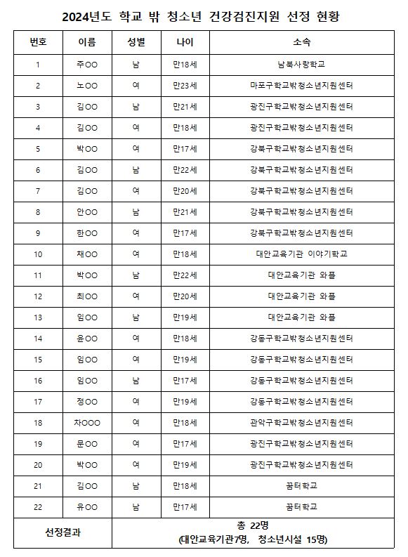 공지사항 HOME > 커뮤니티 > 공지사항 링크공유 프린트 2024년 학교 밖 청소년 건강검진 지원 선정자 알림 관리자 0 210 0 0 Print 글주소 04-11 서울특별시학교밖청소년지원센터는 지역사회 협력기관인 가톨릭대학교 서울성모병원에서 지원하는학교 밖 청소년 건강검진 대상자를 추천하였고, 총 22명자가 선정되어 선정결과를 안내합니다.앞으로도 학교 밖 청소년이 건강한 삶을 영위할 수 있도록 센터는 함께하겠습니다. 0 0 스크랩 목록 이전글 다음글 제목+내용 제목 내용 회원명 회원아이디 번호 제목 글쓴이 날짜 조회수 공지 [서울특별시학교밖청소년지원센터] 찾아오는 길 안내_보라매공원역편 관리자 08-25 979 공지 서울특별시학교밖청소년지원센터 지원 연령 및 대상 안내 관리자 03-16 10,527 공지 [인턴십] 2025년 인턴십 활동비지원 종료안내 관리자 12-15 48 공지 [2025년] 학교 밖 청소년 증빙서류 발급 안내 관리자 04-08 4,544 공지 (※2025년 지원 마감) 2025년 학업지원 사업 [안내문 및 신청서식] 관리자 04-01 10,874 공지 (수정)2025년 성범죄 경력조회 회신서 발급 절차 안내문 관리자 03-20 3,617 507 제21대 대통령선거 휴무 안내(20250603) 관리자 06-02 118 506 근로자의 날 휴무 안내(20250501) 관리자 04-29 128 505 2024년 서울특별시학교밖청소년지원센터 시보조금 결산내역서 관리자 04-22 212 504 센터 사무실 공사로 인한 업무 제한 안내(20250410) 관리자 04-09 194 503 서울특별시학교밖청소년지원센터 2025년 예산내역 공고 관리자 01-15 626 502 서울특별시학교밖청소년지원센터 2024년 3차 전용 예산내역 공고 관리자 12-26 226 501 2023년 서울특별시학교밖청소년지원센터 시보조금 결산내역서 관리자 03-29 214 500 서울특별시학교밖청소년지원센터 2024년 전용 예산내역 공고 관리자 05-16 357 499 2024년 서울특별시학교밖청소년지원센터 상반기(1~6월) 수의계약 내역 관리자 06-28 562 498 2024년 학교 밖 청소년 증빙서류 발급 안내 관리자 06-05 1,171 497 홈페이지 서버 변경 안내 관리자 05-31 239 496 2024년 5월 센터 휴무일 안내 관리자 04-30 317 495 2024년 학교 밖 청소년 및 위기청소년 체험활동 모집완료(선정자 안내) 관리자 04-19 424 494 2024년 학교 밖 청소년 동아리지원사업 선정결과 안내 관리자 04-12 438 493 2024년 학교 밖 청소년 인식개선 온라인 이벤트 당첨자 안내 관리자 04-11 246 492 2024년 학교 밖 청소년 문신제거 지원 선정자 알림 관리자 04-11 227 491 서울특별시학교밖청소년지원센터 기자재 대여 지침 관리자 04-15 279 490 2022년 인턴십 프로젝트 지원사업 3월 최종합격자 발표 관리자 03-29 172 489 2024년 성범죄 경력 조회 절차안내 관리자 03-22 83 488 2023년 서울특별시학교밖청소년지원센터 하반기(7~12월) 수의계약 내역 관리자 01-02 248 목록 <1234567>맨끝 ›