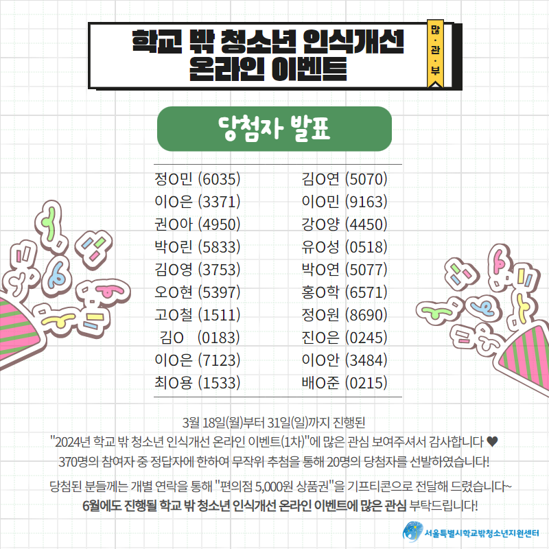 2024년 학교 밖 청소년 인식개선 온라인 이벤트 당첨자 안내