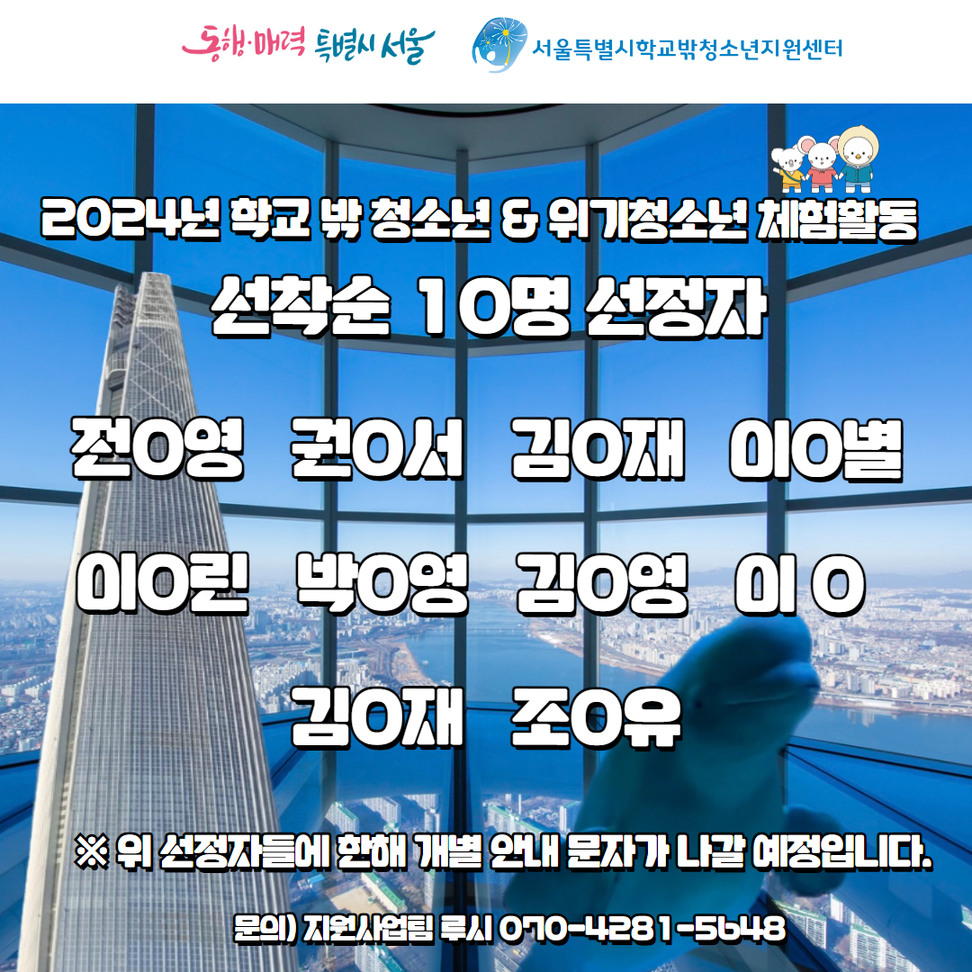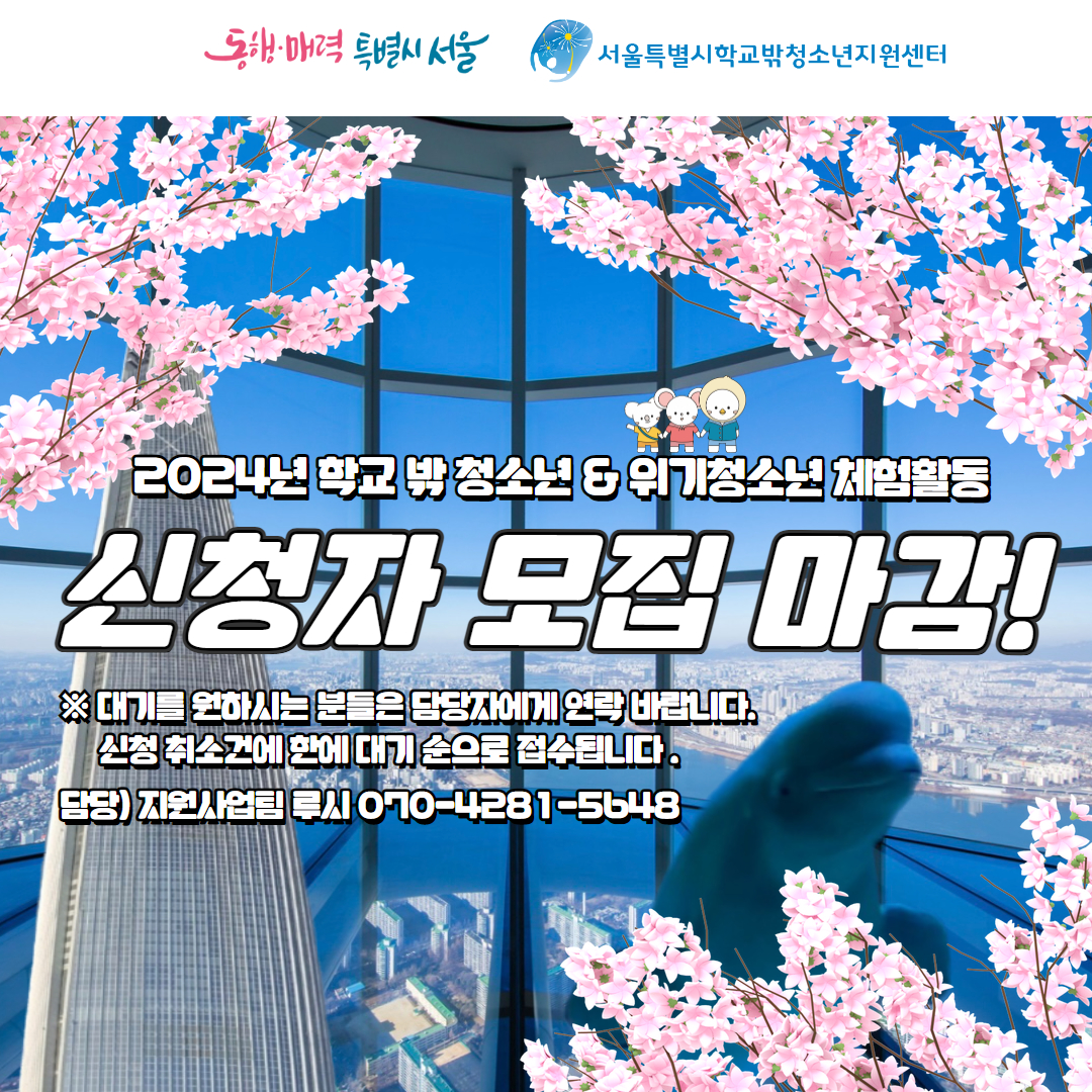 공지사항 HOME > 커뮤니티 > 공지사항 링크공유 프린트 2024년 학교 밖 청소년 및 위기청소년 체험활동 모집완료(선정자 안내) 관리자 0 422 0 0 Print 글주소 04-19 안녕하세요, 서울특별시학교밖청소년지원센터입니다. 2024년 학교 밖 청소년 및 위기청소년 체험활동(1회기)참여자 모집이 완료되었습니다. 대기를 원하시는 분들은 담당자에게 연락바랍니다.※신청 취소건에 한하여 대기 순으로 접수됩니다. 많은 관심에 감사드립니다.문의) 지원사업팀 루시 070-4281-5648 0 0 스크랩 목록 이전글 다음글 제목+내용 제목 내용 회원명 회원아이디 번호 제목 글쓴이 날짜 조회수 공지 [서울특별시학교밖청소년지원센터] 찾아오는 길 안내_보라매공원역편 관리자 08-25 976 공지 서울특별시학교밖청소년지원센터 지원 연령 및 대상 안내 관리자 03-16 10,524 공지 [인턴십] 2025년 인턴십 활동비지원 종료안내 관리자 12-15 42 공지 [2025년] 학교 밖 청소년 증빙서류 발급 안내 관리자 04-08 4,530 공지 (※2025년 지원 마감) 2025년 학업지원 사업 [안내문 및 신청서식] 관리자 04-01 10,865 공지 (수정)2025년 성범죄 경력조회 회신서 발급 절차 안내문 관리자 03-20 3,612 507 제21대 대통령선거 휴무 안내(20250603) 관리자 06-02 117 506 근로자의 날 휴무 안내(20250501) 관리자 04-29 127 505 2024년 서울특별시학교밖청소년지원센터 시보조금 결산내역서 관리자 04-22 211 504 센터 사무실 공사로 인한 업무 제한 안내(20250410) 관리자 04-09 193 503 서울특별시학교밖청소년지원센터 2025년 예산내역 공고 관리자 01-15 625 502 서울특별시학교밖청소년지원센터 2024년 3차 전용 예산내역 공고 관리자 12-26 225 501 2023년 서울특별시학교밖청소년지원센터 시보조금 결산내역서 관리자 03-29 213 500 서울특별시학교밖청소년지원센터 2024년 전용 예산내역 공고 관리자 05-16 356 499 2024년 서울특별시학교밖청소년지원센터 상반기(1~6월) 수의계약 내역 관리자 06-28 561 498 2024년 학교 밖 청소년 증빙서류 발급 안내 관리자 06-05 1,169 497 홈페이지 서버 변경 안내 관리자 05-31 238 496 2024년 5월 센터 휴무일 안내 관리자 04-30 316 495 2024년 학교 밖 청소년 및 위기청소년 체험활동 모집완료(선정자 안내) 관리자 04-19 423 494 2024년 학교 밖 청소년 동아리지원사업 선정결과 안내 관리자 04-12 437 493 2024년 학교 밖 청소년 인식개선 온라인 이벤트 당첨자 안내 관리자 04-11 244 492 2024년 학교 밖 청소년 문신제거 지원 선정자 알림 관리자 04-11 226 491 서울특별시학교밖청소년지원센터 기자재 대여 지침 관리자 04-15 278 490 2022년 인턴십 프로젝트 지원사업 3월 최종합격자 발표 관리자 03-29 171 489 2024년 성범죄 경력 조회 절차안내 관리자 03-22 81 488 2023년 서울특별시학교밖청소년지원센터 하반기(7~12월) 수의계약 내역 관리자 01-02 247 목록 <1234567>맨끝 ›