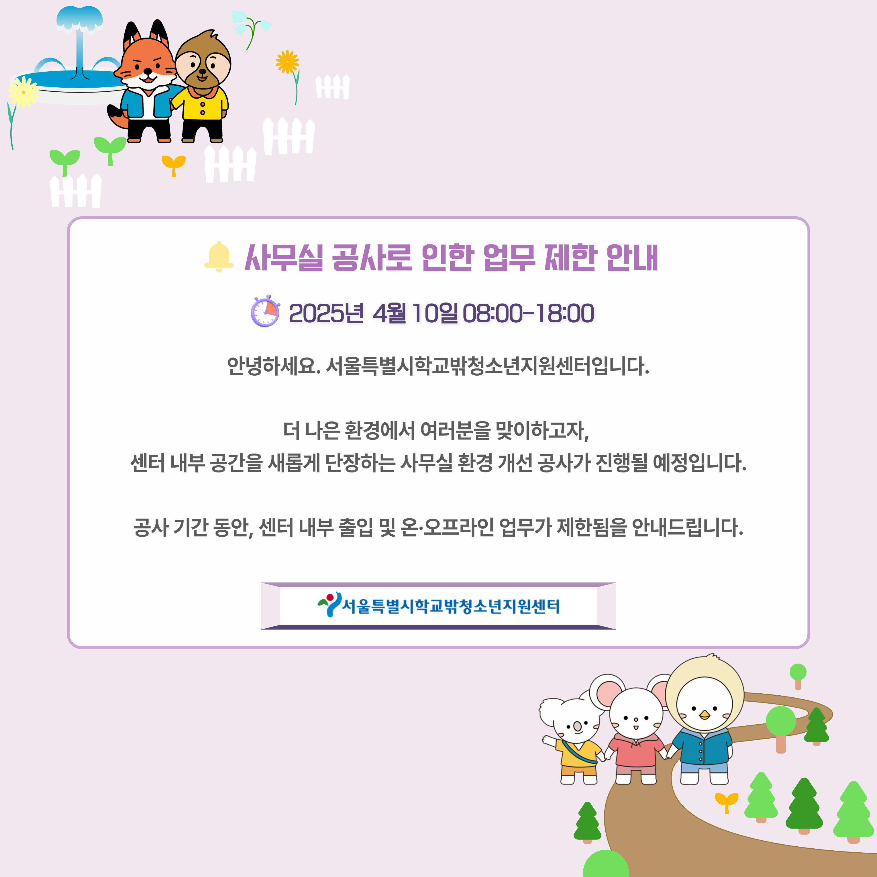 공지사항 HOME > 커뮤니티 > 공지사항 링크공유 프린트 센터 사무실 공사로 인한 업무 제한 안내(20250410) 관리자 0 192 0 0 Print 글주소 04-09 센터 사무실 공사로 인한 업무 제한 안내일시: 2025년 4월 10일 08:00-18:00안녕하세요. 서울특별시학교밖청소년지원센터입니다.더 나은 환경에서 여러분을 맞이하고자, 센터 내부 공간을 새롭게 단장하는 사무실 환경 개선 공사가 진행될 예정입니다.공사 기간 동안, 센터 내부 출입 및 온·오프라인 업무가 제한됨을 안내드립니다. 0 0 스크랩 목록 이전글 다음글 제목+내용 제목 내용 회원명 회원아이디 번호 제목 글쓴이 날짜 조회수 공지 [서울특별시학교밖청소년지원센터] 찾아오는 길 안내_보라매공원역편 관리자 08-25 976 공지 서울특별시학교밖청소년지원센터 지원 연령 및 대상 안내 관리자 03-16 10,523 공지 [인턴십] 2025년 인턴십 활동비지원 종료안내 관리자 12-15 42 공지 [2025년] 학교 밖 청소년 증빙서류 발급 안내 관리자 04-08 4,530 공지 (※2025년 지원 마감) 2025년 학업지원 사업 [안내문 및 신청서식] 관리자 04-01 10,865 공지 (수정)2025년 성범죄 경력조회 회신서 발급 절차 안내문 관리자 03-20 3,612 507 제21대 대통령선거 휴무 안내(20250603) 관리자 06-02 117 506 근로자의 날 휴무 안내(20250501) 관리자 04-29 127 505 2024년 서울특별시학교밖청소년지원센터 시보조금 결산내역서 관리자 04-22 211 504 센터 사무실 공사로 인한 업무 제한 안내(20250410) 관리자 04-09 193 503 서울특별시학교밖청소년지원센터 2025년 예산내역 공고 관리자 01-15 624 502 서울특별시학교밖청소년지원센터 2024년 3차 전용 예산내역 공고 관리자 12-26 225 501 2023년 서울특별시학교밖청소년지원센터 시보조금 결산내역서 관리자 03-29 213 500 서울특별시학교밖청소년지원센터 2024년 전용 예산내역 공고 관리자 05-16 356 499 2024년 서울특별시학교밖청소년지원센터 상반기(1~6월) 수의계약 내역 관리자 06-28 561 498 2024년 학교 밖 청소년 증빙서류 발급 안내 관리자 06-05 1,169 497 홈페이지 서버 변경 안내 관리자 05-31 238 496 2024년 5월 센터 휴무일 안내 관리자 04-30 316 495 2024년 학교 밖 청소년 및 위기청소년 체험활동 모집완료(선정자 안내) 관리자 04-19 422 494 2024년 학교 밖 청소년 동아리지원사업 선정결과 안내 관리자 04-12 437 493 2024년 학교 밖 청소년 인식개선 온라인 이벤트 당첨자 안내 관리자 04-11 244 492 2024년 학교 밖 청소년 문신제거 지원 선정자 알림 관리자 04-11 226 491 서울특별시학교밖청소년지원센터 기자재 대여 지침 관리자 04-15 278 490 2022년 인턴십 프로젝트 지원사업 3월 최종합격자 발표 관리자 03-29 171 489 2024년 성범죄 경력 조회 절차안내 관리자 03-22 81 488 2023년 서울특별시학교밖청소년지원센터 하반기(7~12월) 수의계약 내역 관리자 01-02 247 목록 <1234567>맨끝 ›