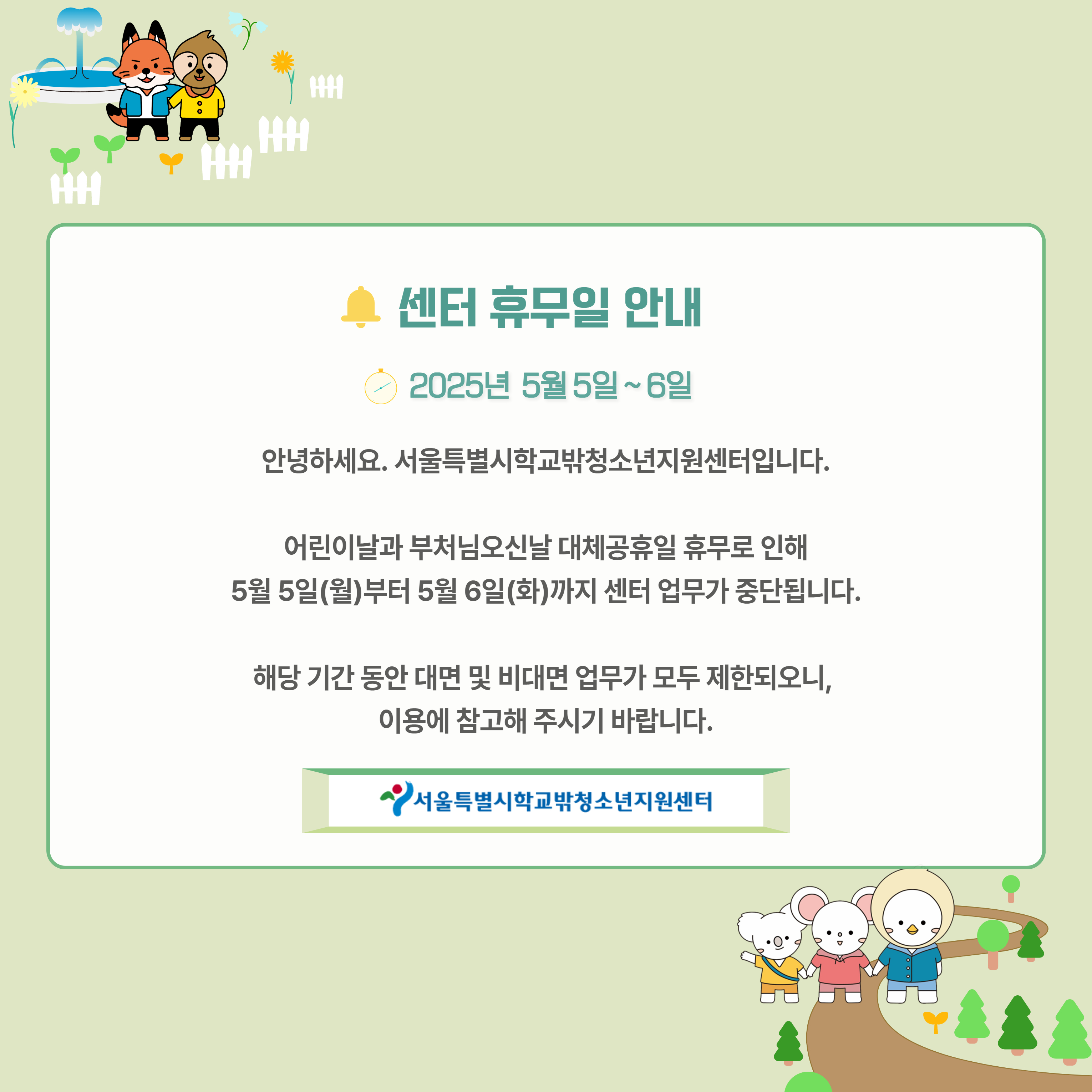 공지사항 HOME > 커뮤니티 > 공지사항 링크공유 프린트 어린이날, 부처님오신날 대체공휴일 휴무 안내(20250505-0506) 관리자 0 130 0 0 Print 글주소 05-02 안녕하세요. 서울특별시학교밖청소년지원센터입니다.어린이날과 부처님오신날 대체공휴일 휴무로 인해5월 5일(월)부터 5월 6일(화)까지 센터 업무가 중단됩니다.해당 기간 동안 대면 및 비대면 업무가 모두 제한되오니, 이용에 참고해 주시기 바랍니다. 0 0 스크랩 목록 이전글 다음글 제목+내용 제목 내용 회원명 회원아이디 번호 제목 글쓴이 날짜 조회수 공지 [서울특별시학교밖청소년지원센터] 찾아오는 길 안내_보라매공원역편 관리자 08-25 977 공지 서울특별시학교밖청소년지원센터 지원 연령 및 대상 안내 관리자 03-16 10,525 공지 [인턴십] 2025년 인턴십 활동비지원 종료안내 관리자 12-15 45 공지 [2025년] 학교 밖 청소년 증빙서류 발급 안내 관리자 04-08 4,534 공지 (※2025년 지원 마감) 2025년 학업지원 사업 [안내문 및 신청서식] 관리자 04-01 10,869 공지 (수정)2025년 성범죄 경력조회 회신서 발급 절차 안내문 관리자 03-20 3,613 527 서울특별시학교밖청소년지원센터 2025년 2차 추경 예산내역 공고 관리자 12-15 37 526 연합성과공유회&정책박람회에 따른 업무 안내(20251205) 관리자 12-05 66 525 직원 워크숍에 따른 업무 안내(20251112) 관리자 11-11 156 524 [학교 밖 청소년을 위한 e-book] 관리자 11-07 134 523 2025년 추석 인사 관리자 10-02 149 522 센터 업무 중단 안내 (대학수학능력시험 9월 모의평가) (20250903) 관리자 09-01 299 521 2025년 서울특별시학교밖청소년지원센터 상반기(1~6월) 수의계약 내역 관리자 07-28 470 520 서울특별시학교밖청소년지원센터 2025년 1차 추경 예산내역 공고 관리자 06-30 333 519 임직원 워크숍 업무 제한 안내(20250702) 관리자 07-01 293 518 [학업지원] 2026학년도 대학수학능력시험 9월 모의평가 응시 신청 안내 관리자 06-26 263 517 2025학년도 대학수학능력시험 센터 출근시간 조정 안내 관리자 11-13 295 516 2024년 서울특별시학교밖청소년지원센터 하반기(7~12월) 수의계약 내역 관리자 01-07 404 515 2025년 새해 인사 관리자 12-31 431 514 센터 크리스마스 휴무 안내 관리자 12-23 215 513 서울특별시학교밖청소년지원센터 2024년 2차 전용 예산내역 공고 관리자 10-11 188 512 2024년 10월 센터 워크숍 휴무 안내 관리자 10-29 270 511 2025년 학교 밖 청소년 수업료 지원 신청(2차) 안내 관리자 06-20 615 510 어린이날, 부처님오신날 대체공휴일 휴무 안내(20250505-0506) 관리자 05-02 131 509 2025년 제2회 초·중·고등학교 졸업학력 검정고시 시행계획 공고 관리자 06-12 396 508 현충일 휴무 안내(20250606) 관리자 06-05 132 목록 123456>맨끝 ›