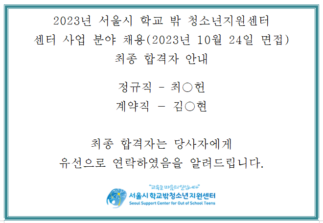 2023 서울특별시학교밖청소년지원센터 사업분야 직원(정규직, 계약직) 채용 최종합격자 발표 안내(2023.…