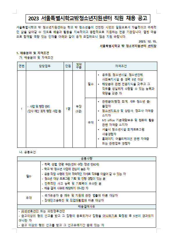 2024 서울특별시학교밖청소년지원센터 직원(부장) 채용 1차 서류 합격자 발표 안내 (2023.12.15. …