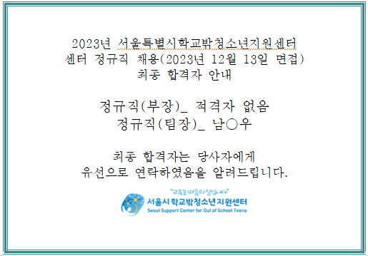 2023 서울특별시학교밖청소년지원센터 직원 채용 최종 합격자 발표 안내 (2023.12.13. 면접건)