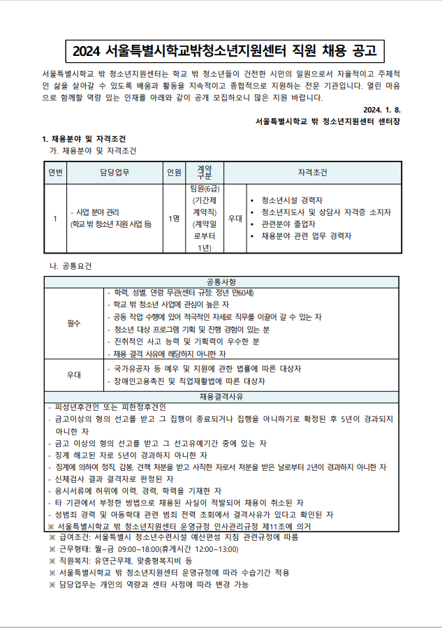 170 2024 서울특별시학교밖청소년지원센터 직원(기간제 계약직) 채용 공고 관리자 01-08 554