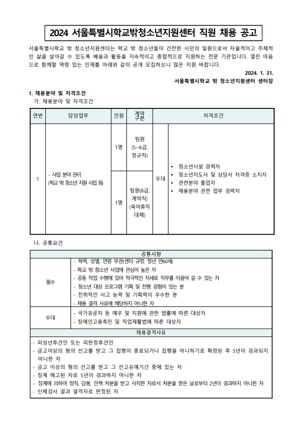 2024 서울특별시학교밖청소년지원센터 직원(기간제 계약직) 채용 최종 합격자 발표 안내 (2024.1.29.…