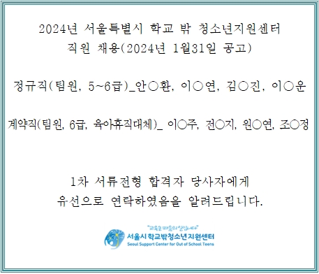 2024 서울특별시학교밖청소년지원센터 직원(기간제 계약직) 채용 1차 서류 합격자 발표 안내 (2024.1.…
