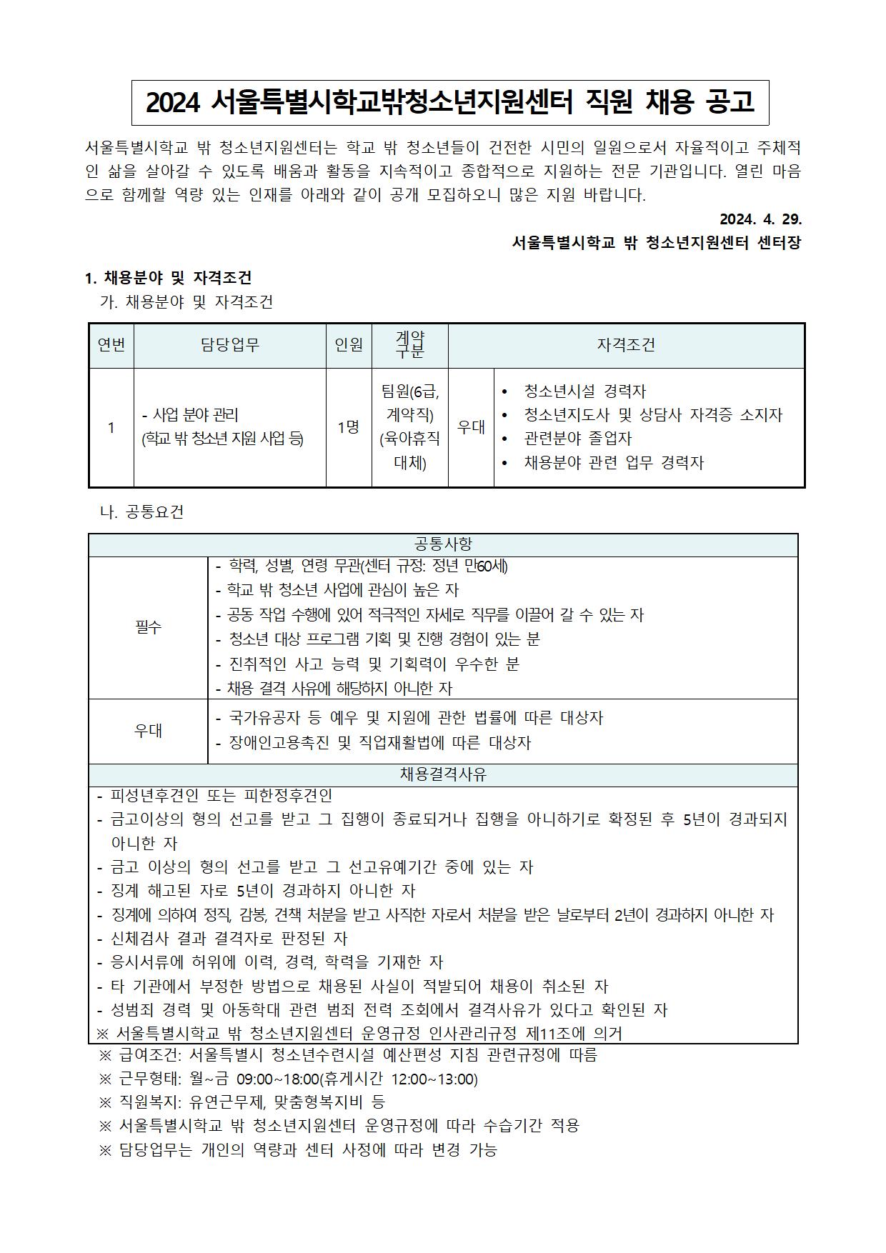 2024 서울특별시학교밖청소년지원센터 직원 채용 1차 서류 합격자 발표 안내 (2024.4.29. 공고건)