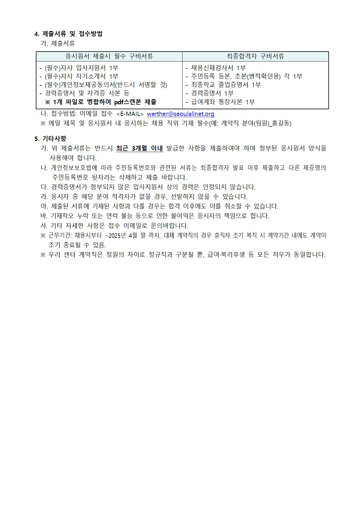 2025년 서울특별시학교밖청소년지원센터 직원(계약직) 채용 1차 서류 합격자 발표 안내 (2025.1.7. …