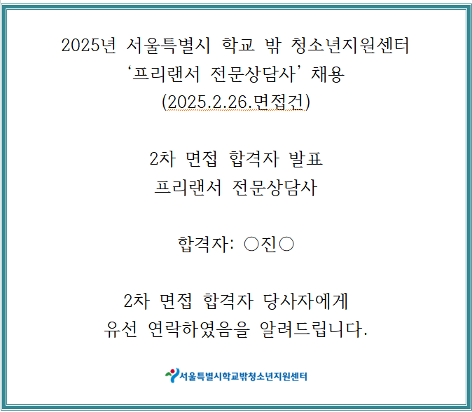 2025년 서울특별시학교밖청소년지원센터 ’프리랜서 전문상담사’ 채용 최종합격자 발표 안내(2025.2.26.…