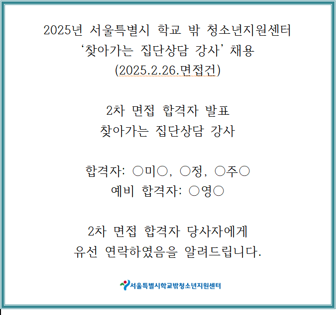 2025년 서울특별시학교밖청소년지원센터 ’찾아가는 집단상담 강사’ 채용 최종합격자 발표 안내(2025.2.2…