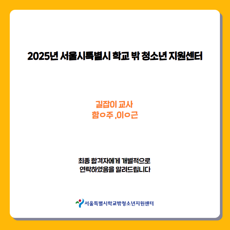 204 2025년 서울특별시학교밖청소년지원센터 직원(계약직) 채용 최종 합격자 발표 안내 (2025.4.14. 면접… 관리자 04-16 312
