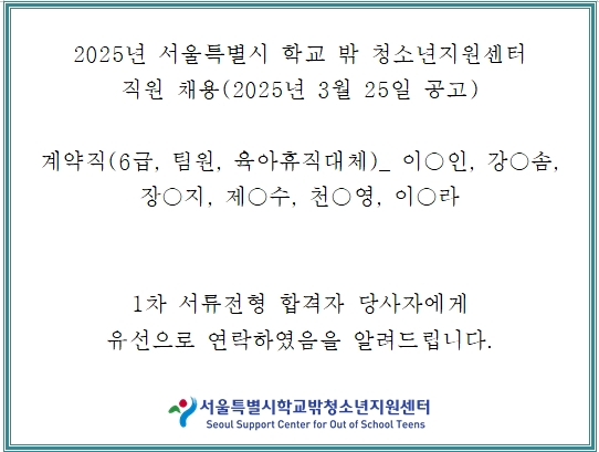 2025년 서울특별시학교밖청소년지원센터 직원(계약직) 채용 1차 서류 합격자 발표 안내 (2025.3.25. 공고건)