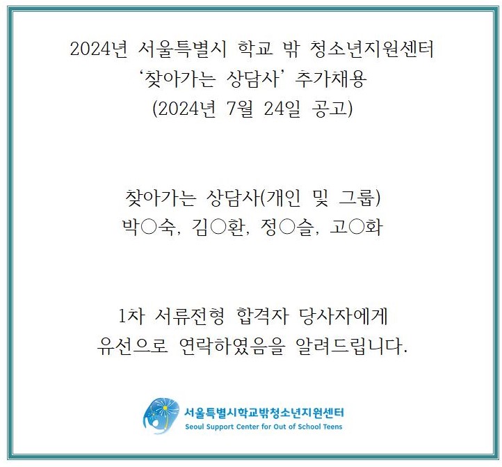 [서울특별시학교밖청소년지원센터]2024년 '찾아가는 상담사' 추가채용 1차 서류합격자 발표안내(2024.7.24. 공고건)