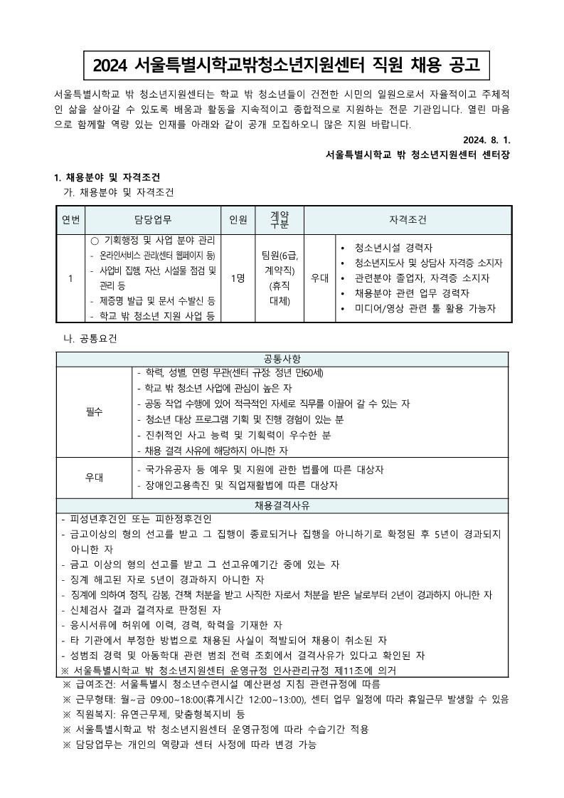 2024 서울특별시학교밖청소년지원센터 직원(계약직) 채용 1차 서류 합격자 발표 안내 (2024.8.22. …