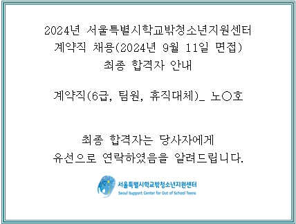 2024 서울특별시학교밖청소년지원센터 직원(계약직) 채용 최종합격자 발표 안내(2024.9.11.면접건)