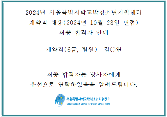 2024 서울특별시학교밖청소년지원센터 직원(계약직) 채용 최종합격자 발표 안내(2024.10.23.면접건)