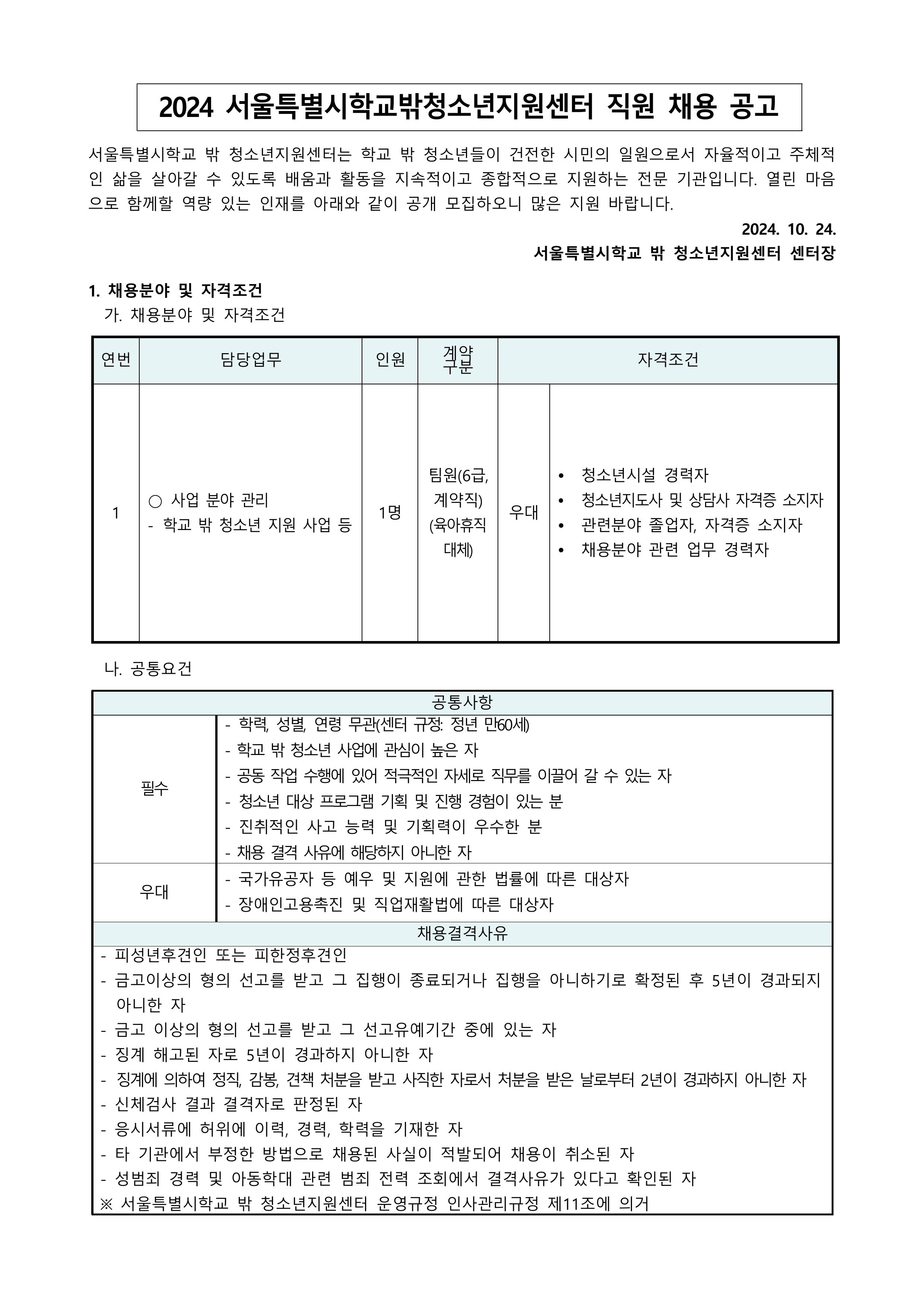 2024 서울특별시학교밖청소년지원센터 직원(계약직) 채용 최종합격자 발표 안내(2024.10.23.면접건)