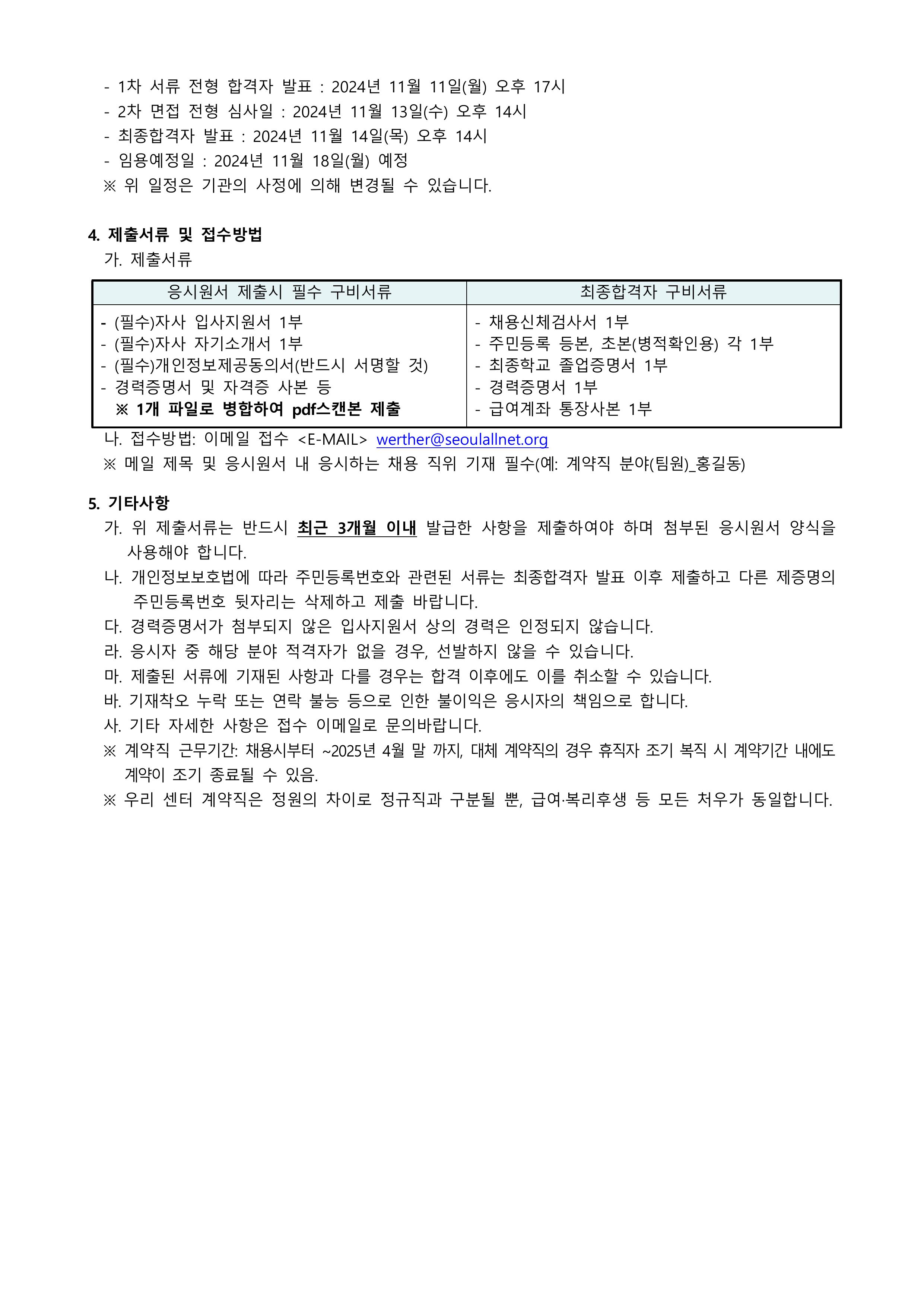 2024 서울특별시학교밖청소년지원센터 직원(계약직) 채용 1차 서류 합격자 발표 안내 (2024.10.24.…