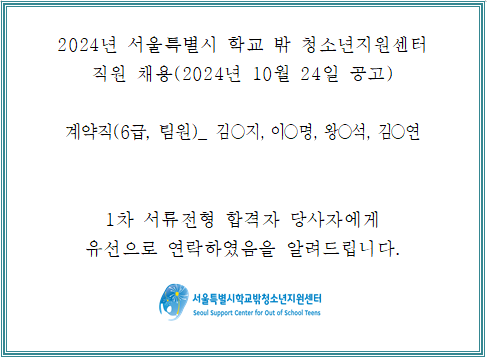 2024 서울특별시학교밖청소년지원센터 직원(정규직) 채용 1차 서류 합격자 발표 안내 (2024.10.24.…