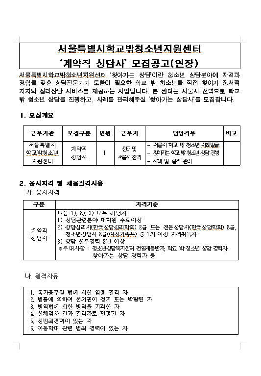 2025 서울특별시학교밖청소년지원센터 계약직 상담사 모집 재공고(연장)