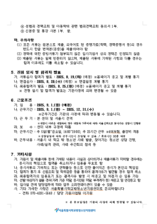 2025 서울특별시학교밖청소년지원센터 '계약직 상담사' 모집 일정변경 안내(2025.8.20.공고건)