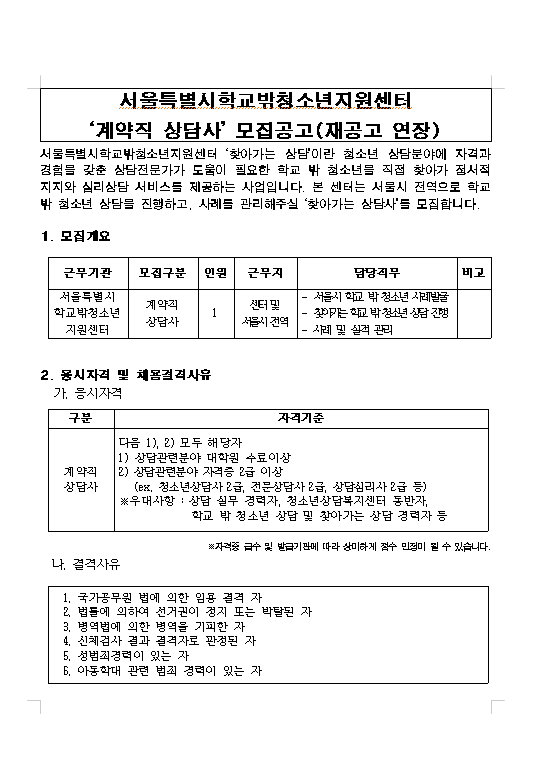 2025 서울특별시학교밖청소년지원센터 계약직 상담사 모집 재공고(연장)