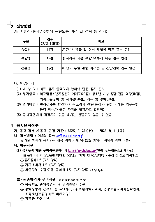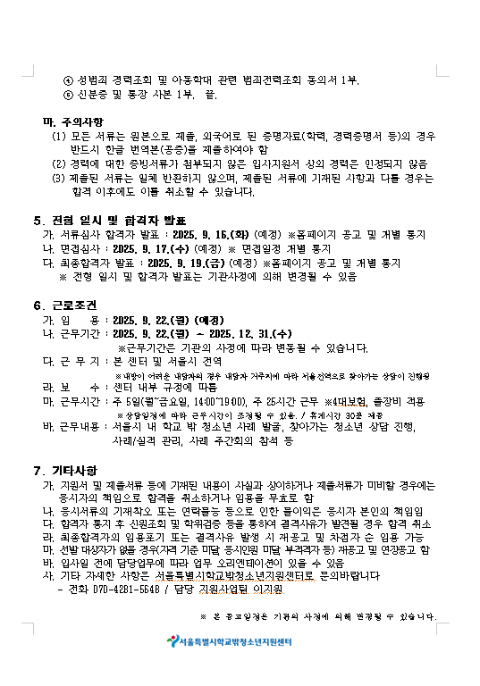 238 2025 서울특별시학교밖청소년지원센터 '계약직 상담사' 모집 일정변경 안내(2025.8.20.공고건) 관리자 09-09 162