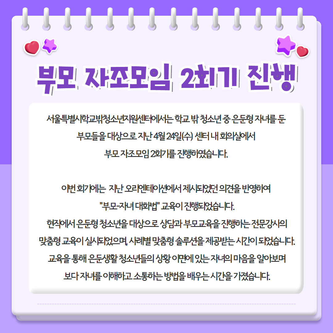활동소식 HOME > 커뮤니티 > 센터 소식 > 활동소식 링크공유 프린트 2024년 서울특별시학교밖청소년지원센터 부모 자조모임 2회기 진행 관리자 0 115 0 0 Print 글주소 05-07 0 0 스크랩 목록 이전글 다음글