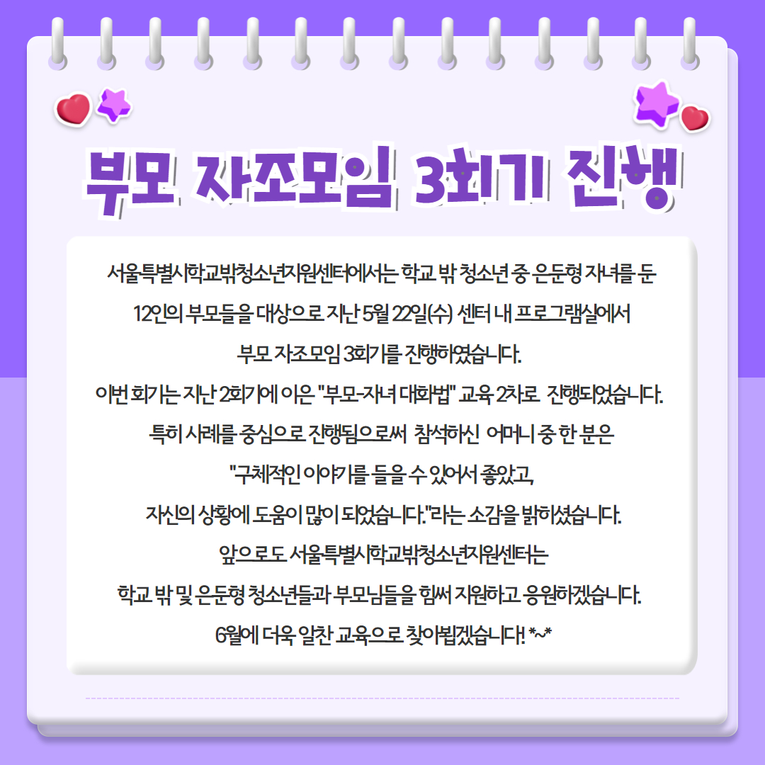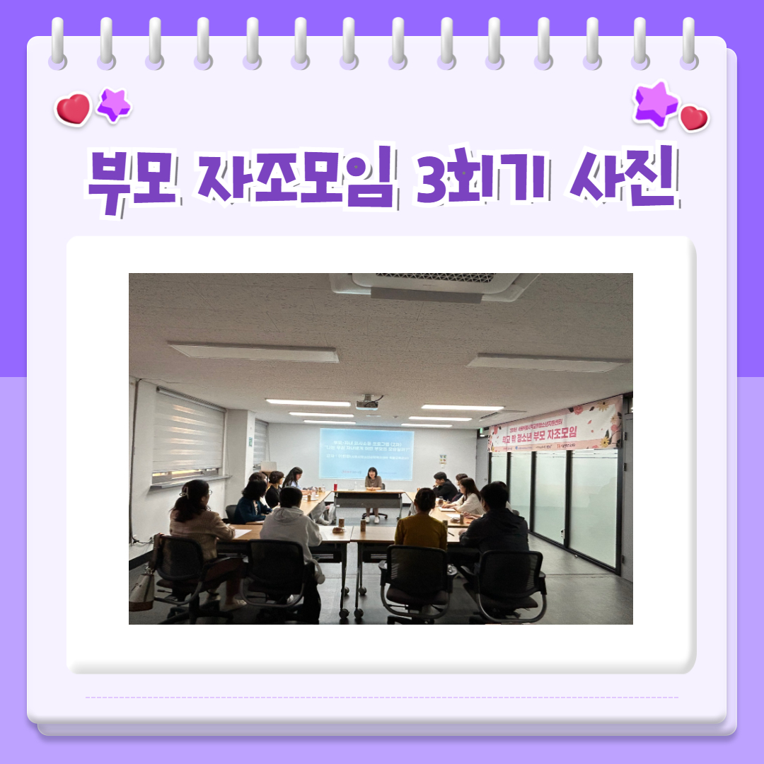 활동소식 HOME > 커뮤니티 > 센터 소식 > 활동소식 링크공유 프린트 2024년 서울특별시학교밖청소년지원센터 부모 자조모임 3회기 진행 관리자 0 160 0 0 Print 글주소 05-24 *상시로 모집을 진행하고 있으니 관심있는 부모님들께서는 언제든 신청해주세요!(문의: 루시 070-4281-5648)2024년 부모 자조모임 추가모집 신청서 - Google Forms 0 0 스크랩 목록 이전글 다음글