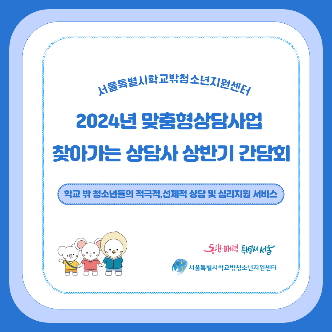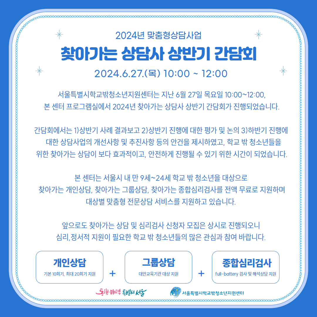 활동소식 HOME > 커뮤니티 > 센터 소식 > 활동소식 링크공유 프린트 2024년 찾아가는 상담사 상반기 간담회 관리자 0 196 0 0 Print 글주소 06-28 2024년 맞춤형상담사업 찾아가는 상담(개인상담, 그룹상담, 종합심리검사) 신청하기서울시학교밖청소년지원센터 (seoulallnet.org)*문의: 루시 070-4281-5648 0 0 스크랩 목록 이전글 다음글