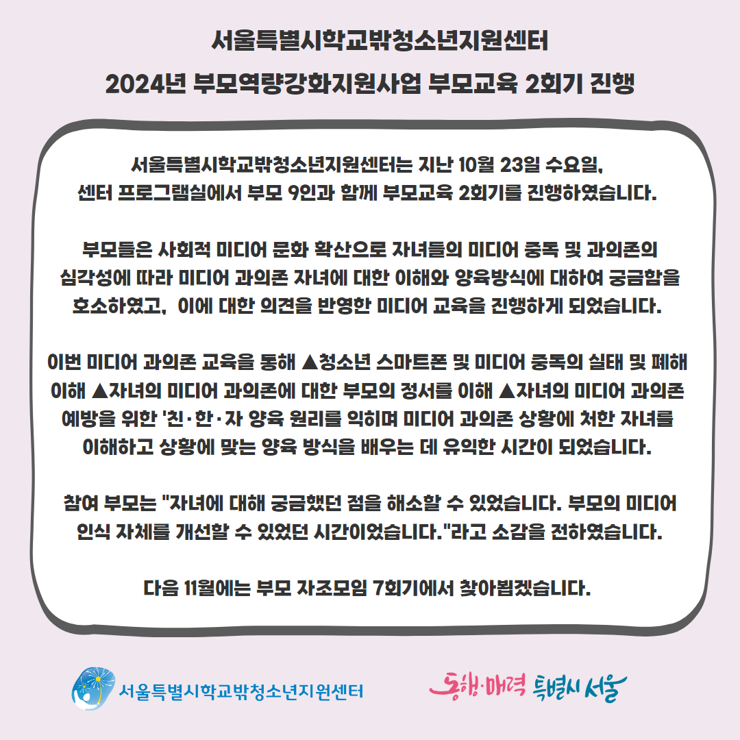 활동소식 HOME > 커뮤니티 > 센터 소식 > 활동소식 링크공유 프린트 2024년 부모역량강화지원사업 부모교육 2회기 진행 관리자 0 664 0 0 Print 글주소 10-28 0 0 스크랩 목록 이전글 다음글